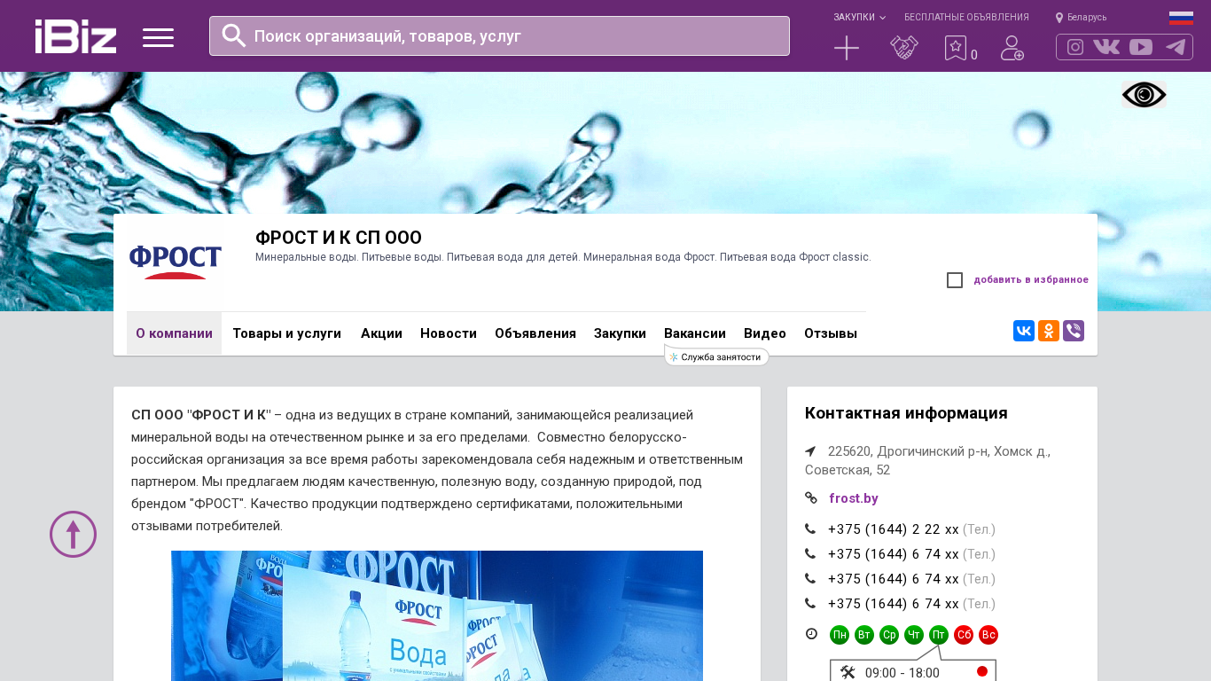 | Название / Заголовок | ФРОСТ И К СП ООО - Минеральные воды. Питьевые воды. Питьевая вода для детей. Минеральная вода Фрост. Питьевая вода Фрост classic.. 225620, , Хомск д., Советская, 52 |