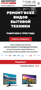 | AI-анализ | This website is for ОДО Комплект сервис, a service center for repairing various household appliances. The title is "Главная" (Home), and the description includes keywords related to repair, household items, services, and contacts. The top words include repair (69 times), appliances (12 times), services (11 times), and contacts (7 times). The website provides contacts for TVservice@mail.ru and three phone numbers, as well as information about services, the company, news, reviews, and consultations. The website offers repair services for televisions, monitors, fax machines, washing machines, dishwashers, kitchen appliances, irons, blenders, breadmakers, coffee machines, multicookers, refrigerators, vacuum cleaners, microwave ovens, duct hoods, valve panels, and more. The website also offers |