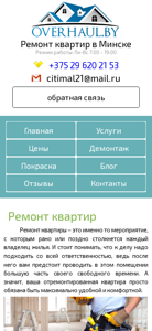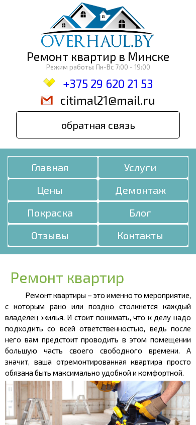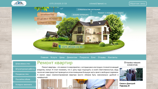 AI-анализ | The website is a home improvement and renovation service for apartments in Minsk and the Minsk region. It offers both full-scale renovation projects and small repair jobs at affordable prices. Services include wall painting, ceiling work, flooring installation, electrical and plumbing repairs, and more. Users can contact the company for a quote and to schedule a consultation. The website provides a list of offered services, pricing details, and a blog. The contact information includes a phone number and an email address. The business operates from Monday to Sunday, 7:00 AM to 7:00 PM. The domain name is overhaul.by. |