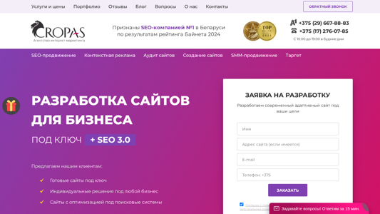 SEO-описание | Заказать создание сайтов в Минске под ключ. Выгодные цены на разработку веб-сайтов в Беларуси. Заказать создание Landing, интернет-магазина в веб-студии CROPAS. |
