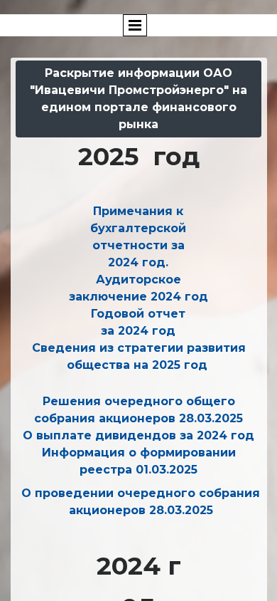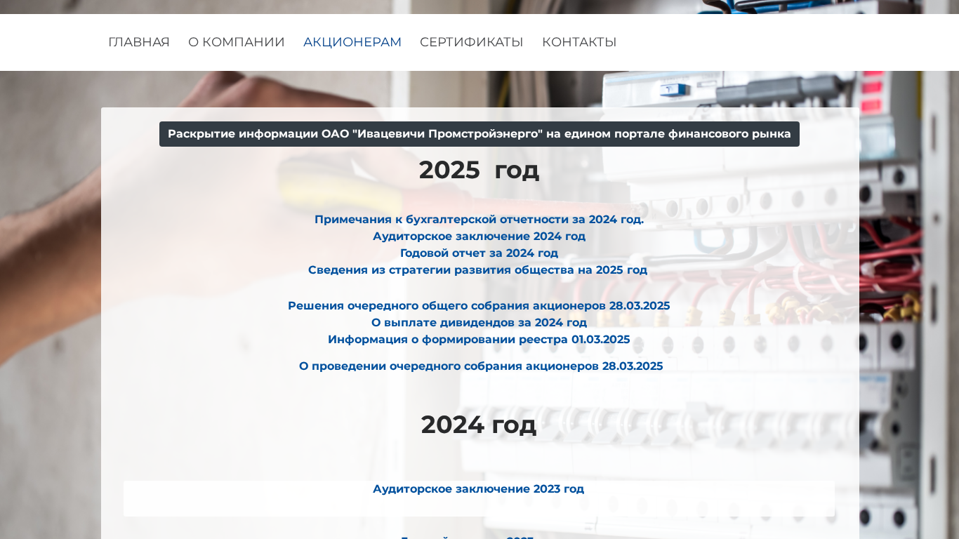 | AI-анализ | --- This website is dedicated to providing shareholder information for OAO "Ивацевичи Промстройэнерго" (Ivatsevich Promstroyenergo). The site contains annual reports, auditor's reports, and information about shareholder meetings and dividend payments dating back to 2017. Users can access reports for each year, including the auditor's report, annual report, and shareholder meeting minutes. The site also includes a register of shareholders and information about dividend payouts. The site is organized into sections for each year, with links to the relevant reports and documents. The title and description of the website are "Акционерам" (Shareholders) and the domain is "psenergo.by". |