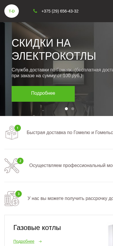 | AI-анализ | --- This website is an online store for heating equipment in the Gomel region of Belarus. It offers a detailed catalog with free shipping for orders over 100 rubles. Contact information is provided. The store specializes in boilers, furnaces, water heaters, and related components for heating homes and industries. It offers a range of heating solutions that operate on electricity, natural gas, wood, and coal. The website provides professional installation services and flexible payment options, including installment plans of up to two years. The store also stocks a variety of news and articles on heating and related topics. The website is accessible at [t-dom.by](http://t-dom.by). |
