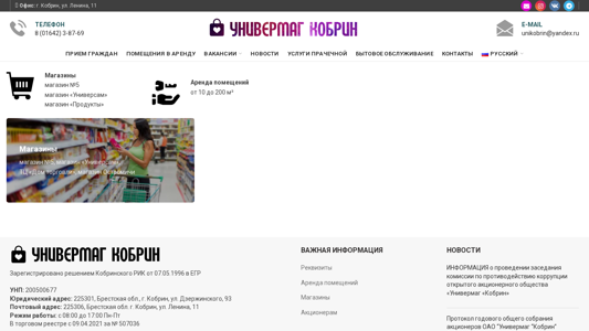 | AI-анализ | This online resource is a website for Open Joint Stock Company "Universmag Cobrin," located in Cobrin, Belarus. The website provides information on various services and offerings, including the reception of citizens, renting out spaces, job vacancies, news, and services such as a laundry and household services. Users can contact the company via email, Instagram, Telegram, or by phone at two provided numbers. The menu of the site includes sections for citizen reception, rental properties, job applications, news, and services. The company was registered in 1996 and its legal address is in Cobrin on Lenina Street. The site also mentions an auction for the sale of the "Dom Byta" building on November 30, 2022, at 10:00. The company's UNP number is 200500677 and it is registered |