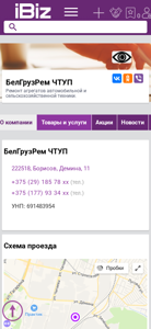 | AI-анализ | The portal belgryzrem.ibiz.by is dedicated to the company BelGruzRem CTUP, providing repair services for automobile and agricultural machinery. The website offers a map scheme, contact telephone numbers, and the address of the company located in Borisov, Belarus, at Demina 11. The main sections of the portal include 'Company', 'Goods and Services', 'Autoservice and Repair', 'Ads and Purchases', 'Vacancies', 'Videos', 'Reviews', and 'Contacts'. The company's operating hours are from 9:00 am to 6:00 pm, Monday through Friday, with Saturdays and Sundays being holidays. The website is categorized under 'Auto-service and repair' and 'Agriculture' in the Ibiz.by business directory. |