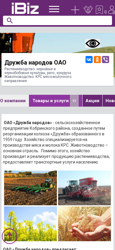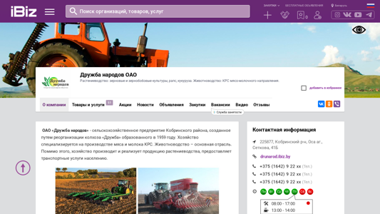 | Название / Заголовок | Дружба народов ОАО - Растениеводство: зерновые и зернобобовые культуры, рапс, кукуруза. Животноводство: КРС мясо-молочного направления.. 225877, , Оса аг., Сеткова, 41Б |