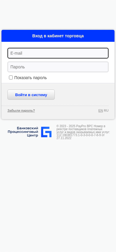 | Название / Заголовок | PayPro BPC Номер в реестре поставщиков платежных услуг и видов оказываемых ими услуг: 112.190381773.1-0-3-0-0-0-7-8-9 от 27.11.2022 |