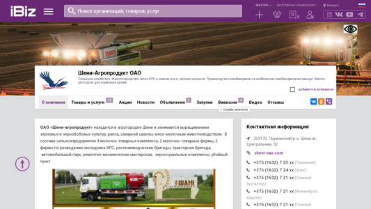 | AI-анализ | This website is for the agricultural company "Шени-Агропродукт ОАО" located in the village of Sheni, Centralna Street 52. The company specializes in agricultural production, focusing on livestock farming, particularly raising cattle for meat and milk, and the production of combinable feeds using a mobile combine mill. They also produce rapeseed oil for animal feed. The website includes sections for company information, products and services, and announcements for free classified ads. The company's offerings include milk, meat from live cattle, agricultural produce, and products that meet all current standards and regulations. The company continues to expand its product line by increasing production capabilities and updating equipment. They operate a fleet of 57 tractors, including self-propelled loaders, corn and grain harvesters, tractors, and other machinery. The company also offers transportation services and has a |