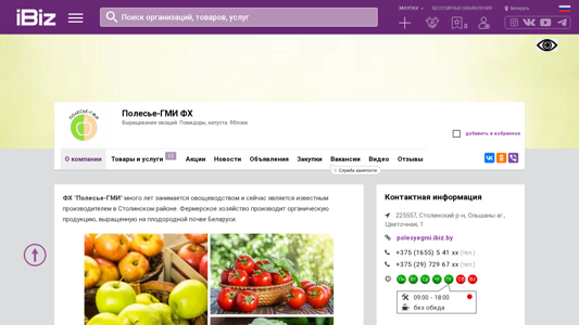 | Название / Заголовок | Полесье-ГМИ ФХ - Выращивание овощей. Помидоры, капуста. Яблоки. . 225557, , Ольшаны аг., Цветочная, 1 |