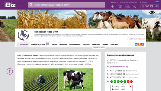 | AI-анализ | --- The portal Polesskaya Niva OAO is a breeding farm of republican significance for the breeding of Belarusian draft horse breed. Only purebred stallions are used in breeding. Production includes milk, meat, grain, and potatoes. 225551, , Remel d., Urodnicha, 7. Services, 375 Belarus, new announcements, personal cabinet, menu. Polesskaya Niva OAO is a multi-branch agricultural enterprise employing over 580 people. The farm specializes in dairy-livestock farming and also operates a breeding horse farm. The total land area of the farm is 13,175 ha, of which 9,953 ha are arable land, 3,318 ha are pasture, and 6, |