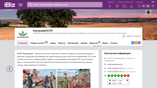 | AI-анализ | This web project is a farming collective, "Ruhchanski KSUP," located in Belarus, offering animal husbandry and crop production services. The collective specializes in milk and meat production from cattle, as well as farming of grains, corn, grechka (buckwheat), rapeseed, and perennial crops. They also collect and store feed. The company is situated in the Shtolin district, boasting modern agricultural facilities, including livestock farms, young stock breeding farms, a transport fleet with specialized and agricultural vehicles, repair workshops, warehouses, and grain drying complexes. The enterprise produces and sells milk and cattle, as well as crops such as grains, corn, grechka, rapeseed, and perennial crops. They continually expand their product range, adhere to quality control, and modernize equipment, expand their transport fleet, and introduce |