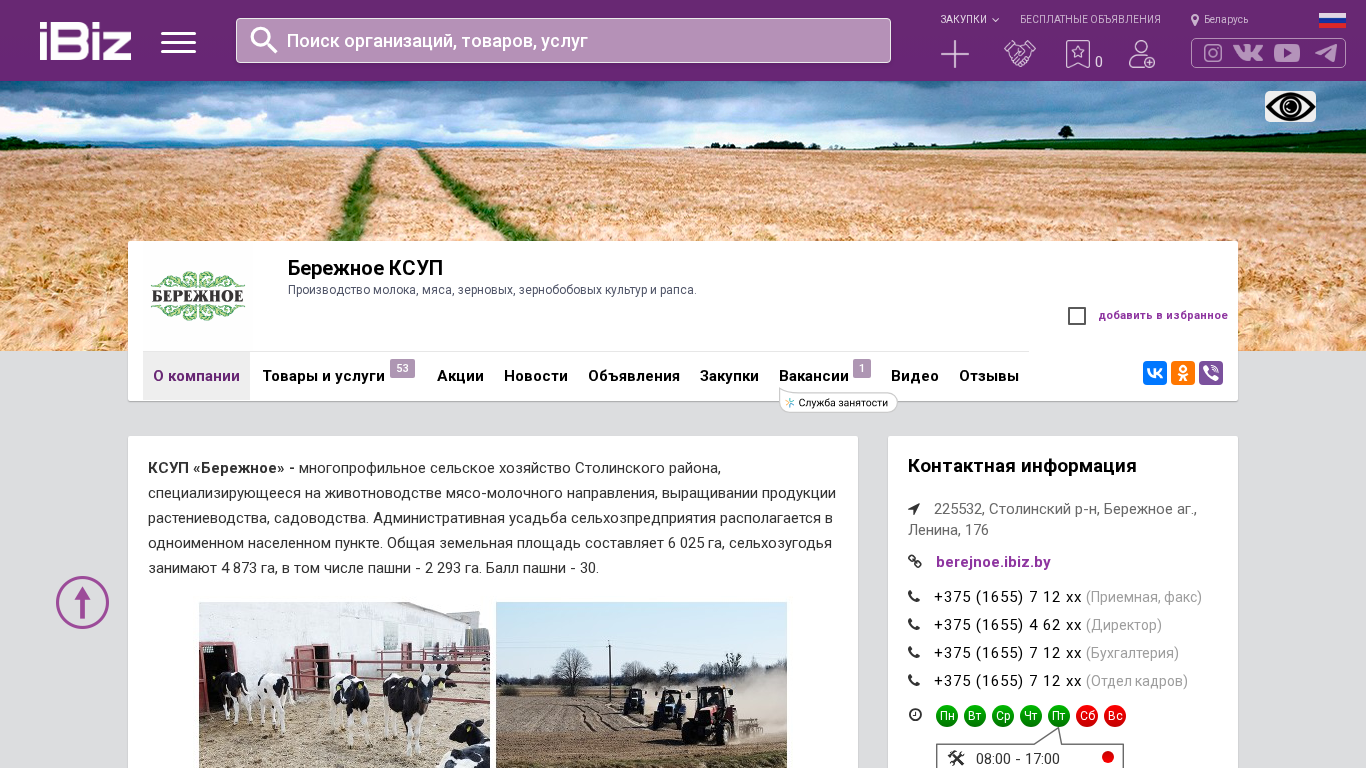 | Название / Заголовок | Бережное КСУП - Производство молока, мяса, зерновых, зернобобовых культур и рапса. . 225532, , Бережное аг., Ленина, 176 |