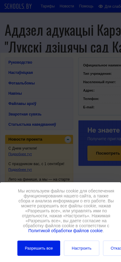 | AI-анализ | The portal "Lukisad.schools.by" is a website for the Children's Garden of the Karalica District Executive Committee DUA "Luxki Dziecy Sad Karielicaga Raiona" in Belarus. The website uses cookies for its operation and data collection and analysis. Visitors can allow all cookies or manage them individually, with options to accept, reject or configure. The site includes information on educational services, activities, and schedules for the Children's Garden. The domain name includes the acronym "DUA," likely representing the name of the district executive authority. The title and description include the phrase "Children's Garden," suggesting a focus on early childhood education. Keywords related to education and the Children's Garden, such as "adukacyi," "sad," "dziecey," and "karielicaga," are present in the top words. |