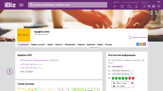| AI-анализ | language: ru This website is for Krafteh OOO, a lombardy (pawnshop) located in Minsk, Belarus at Partizansky pr-t 144, room 5. The website provides information on the company's address, contact phone numbers, and a map for directions. The business hours are from 9:00 AM to 6:00 PM, Monday to Friday, with weekends being closed. The website also includes sections for company information, goods and services, news, announcements, vacancies, videos, and customer reviews on social media platforms like VKontakte, Odnoklassniki, and Viber. The company's Unified State Register number is 192738471. |