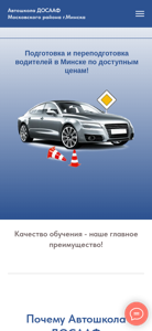 | AI-анализ | This website is for an auto school in Moscow District, Minsk, Belarus, located on Semashko 15. The title and description indicate that the school offers affordable prices and good reviews for driving lessons, including theory and practical training for various licenses (B, C, A, E, and VIP). The main content includes sections for services, advantages, pricing, vacancies, and contacts. The school boasts a long history, having been in operation for 40 years and producing around 1960 graduates annually, with a high success rate of 85% in passing driving exams. The facilities include a modern 3500 square meter autodrome and flexible scheduling with morning, evening, and weekend classes. The vehicles used for training are modern cars from the 2015-2020 model range, and the school offers payment plans. |