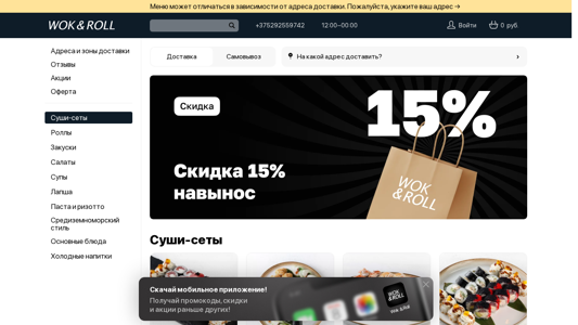 | AI-анализ | --- This online resource, titled "Wok & Roll Минск," is a Belarusian restaurant website. The description section mentions that the menu may vary depending on delivery address, and provides a phone number for orders. The website offers sets of sushi rolls, including sets with Philadelphia, mango rolls, crab rolls, and unagi maki. Other offerings include teriyaki maki, rolls in rice paper, and sets with various rolls and prices ranging from 55 to 59 rubles. The website also mentions delivery and self-pickup options. |