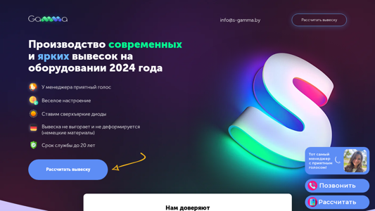 | AI-анализ | --- The web project "s-gamma.by" is a custom signage and LED display manufacturing company based in Belarus. The website offers consultation services and provides clients with the opportunity to calculate the cost of their desired signage project, selecting various sizes and materials, ranging from standard signs to large-scale, three-meter long neon displays. The company specializes in the production of modern, bright LED displays using 2024 equipment and offers a wide range of services including, but not limited to, light boxes, pillars, and stalls. Clients can request a design mockup free of charge and receive a consultation by contacting the company through various means such as Telegram, Viber, or by phone. The company guarantees high-quality, long-lasting displays made from durable German materials and boasts a portfolio of satisfied clients and positive reviews. The website is user-friendly and allows clients |