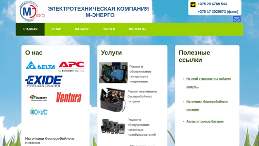 | AI-анализ | This online resource is the official website of M-Energy, an electrotechnical company specializing in the supply of equipment for power backup systems, including battery-based uninterruptible power sources (UPS) and Delta SE series electronics. Keywords suggest that the company offers a range of backup power solutions, as well as services for their repair and maintenance. The site also mentions LED lighting products and uptime services. The top words indicate a strong focus on backup power, with significant mentions of batteries, voltage, and power sources. The company appears to offer a range of services, from the repair and maintenance of generators and UPS systems, to the testing and servicing of battery systems. The site includes a catalog featuring DELTA B.B. battery ventura, as well as a section on the company's history and mission. The site also includes contact information for the company. |