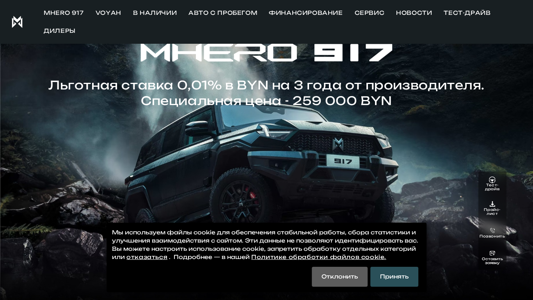 | AI-анализ | This website is the official importer of M-HERO in Belarus. It offers a rugged off-roader with advanced technologies. The vehicle boasts a brutal exterior and a luxurious interior. The site provides information on test drives, financing, leasing, and dealers. The model MHERO 917 VOYAH is in stock with a special price of 259,000 BYN and a low interest rate of 0.01% for three years from the manufacturer. The website also features news and reviews about MHERO vehicles, including the MHERO 817 and the luxury off-roader MHERO 917, which was a star at the Motorshow-2024. The brand's philosophy emphasizes a no-compromise off-roader with high-tech features, electrification, and reform. The |