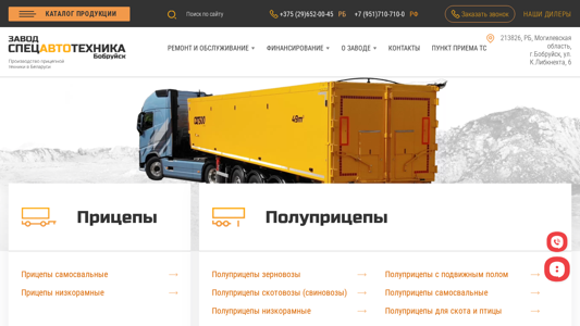 | AI-анализ | The website is a production catalog for specialized trailers and semi-trailers manufactured by Завода Спецавтотехника (Special Auto-Technology Plant). The focus is on industrial and agricultural applications, with products including low-frame trailers, livestock trailers, grain wagons, and container trailers. The site provides a catalog of these products, contact information for ordering (Belarus: +375 (29) 652-00-45, Russia: +7 (951)710-710-0), and a list of dealers. The site is organized by trailer type and industry application, with separate sections for self-loading trailers, forestry equipment, and various industries like agriculture, transportation, construction, and waste management. The site also includes information on the application and usage of different types of trailers. |