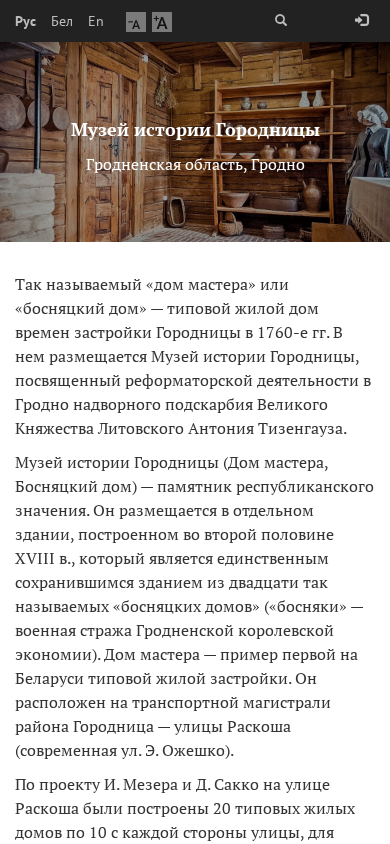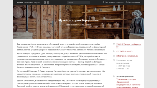 | AI-анализ | The web project "Музей истории Городницы" (Gorodnica Museum) is dedicated to the history of the city of Grodno, with news and event listings, visitor information, pricing, exhibition details, collections, and resources for museum professionals. The museum is located in a historic building known as the "дом мастера" or "босняцкий дом," a typical residential dwelling from the 1760s. This well-preserved structure is the only surviving example of the twenty such houses built for foreign craftsmen invited by the Grodno starosta (Anton Tyszkiewicz-Litawor) to work on local manufactory projects. The compact, nearly square building (8m x 9m) features a stone facade with symmetrical first-floor windows and an attic window, as well as a baroque- |