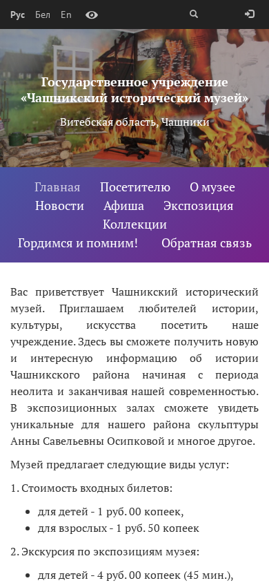 | SEO-описание | Государственное учреждение «Чашникский исторический музей» — новости и афиша мероприятий, информация для посетителей, цены, экспозиция, коллекции, материалы для музейщиков. |