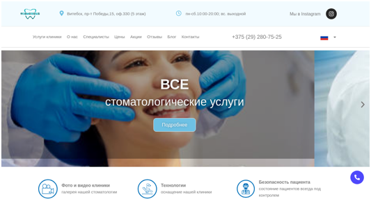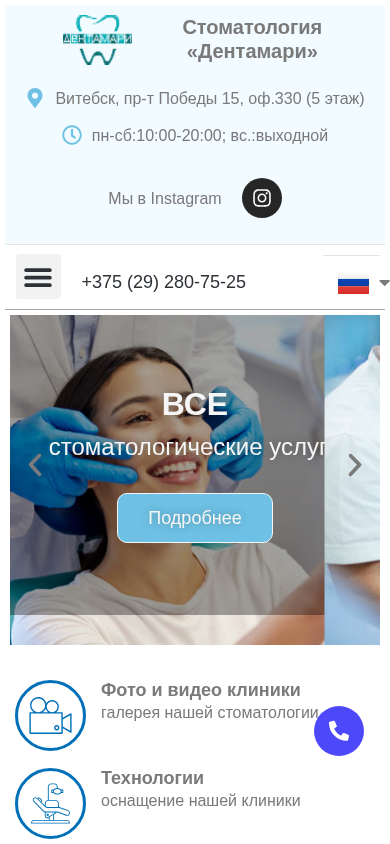 | AI-анализ | This online resource is a dental clinic website named "Дентамари" (Dentamari) located in Vitsebsk, Belarus, specifically at pr-t Poebedy 15, of.330 (5th floor). The clinic offers various dental services such as therapeutic dentistry, Rentgen diagnosis, prosthodontics, orthodontics, and surgery in dentistry. The website contains information about the clinic's specialists, prices, ongoing promotions, and patient reviews. The contact information includes phone numbers +375 (29) 280-75-25, +375 (29) 280-75-25, +375 (44) 580-75-25, +375 (212) 60-75- |