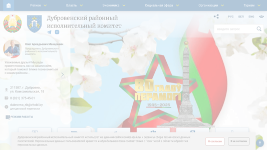 | AI-анализ | This website belongs to the Dubrovensky Regional Executive Committee in Belarus. The title and description both use the name 'Дубровенский РИК' (Dubrovensky RIK), which translates to 'Dubrovensky Regional Executive Committee'. The top keywords include 'беларусь' (Belarus), 'республики' (republics), '2025' (a year), 'октября' (October), 'данных' (data), 'персональных' (personal), and 'дубровенский' (Dubrovensky). The menu includes sections for citizen appeals, a single-window information day, public discussion, and the 'Книга памяти' (Book of Memory), among others. The website covers topics related to the Dubrovensky district, including its history, population, |