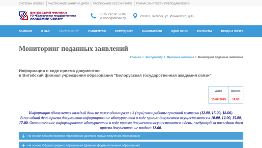 | AI-анализ | The website monitor.vfbsac.by is dedicated to managing applications for a specific educational institution. The title of the website is "Мониторинг поданных заявлений" (Monitoring Applications), and the description includes various keywords related to applications, specialties, and admissions. The website provides information about the institution's history, administration, structures, resources, and facilities, including a virtual tour of the campus and academic buildings. It also offers information on tuition fees, housing for students, and contact details. The website uses Moodle for scheduling classes and managing student information. The domain is registered to the Vitsebsk State Agricultural College (VFBSAC) located in Vitsebsk, Belarus. |