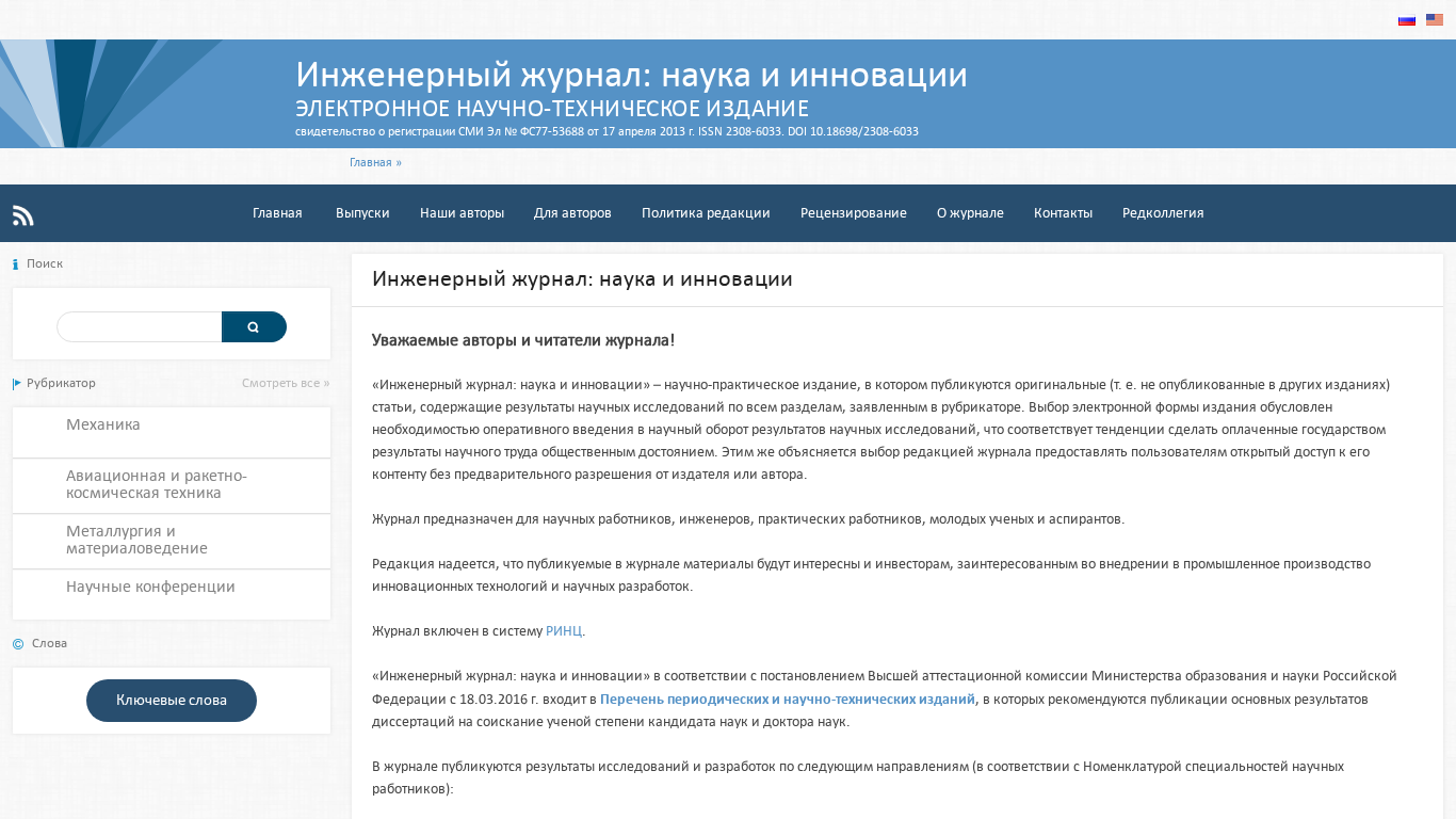 | AI-анализ | This website is an electronic scientific-technical publication called "Engineering Journal: Science and Innovations." It is a registered media outlet with registration number FS77-53688 from April 17, 2013, and an ISSN number of 2308-6033, as well as a DOI number of 10.18698/2308-6033. The main sections of the website include "Issues," "Authors," "Publication Policy," "About the Journal," and "Contacts." The journal is aimed at scientific researchers, engineers, practical workers, young scientists, and graduate students. It publishes original articles containing the results of scientific research in all fields listed in the rubricator. The choice of electronic publishing is to make research results publicly available as quickly as possible, reflecting the |