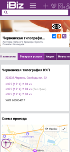 | AI-анализ | The website is for Chervenская типография KUP, a print shop offering services such as flyers, catalogs, brochures, booklets, posters, and calendars. The address and contact telephone numbers are provided, along with a map scheme for reaching the location in Chervень, Belarus. The business offers various printing services and is listed under the categories 'Polygraphic services, typographies' in the Yandex Business Directory. The website includes sections for company information, products and services, news, and contact details. The opening hours are indicated as Monday to Friday from 8:00 to 17:00, with no lunch break. The domain is registered to OOO "AIBIZ MEDIA," a Belarusian company directory. |