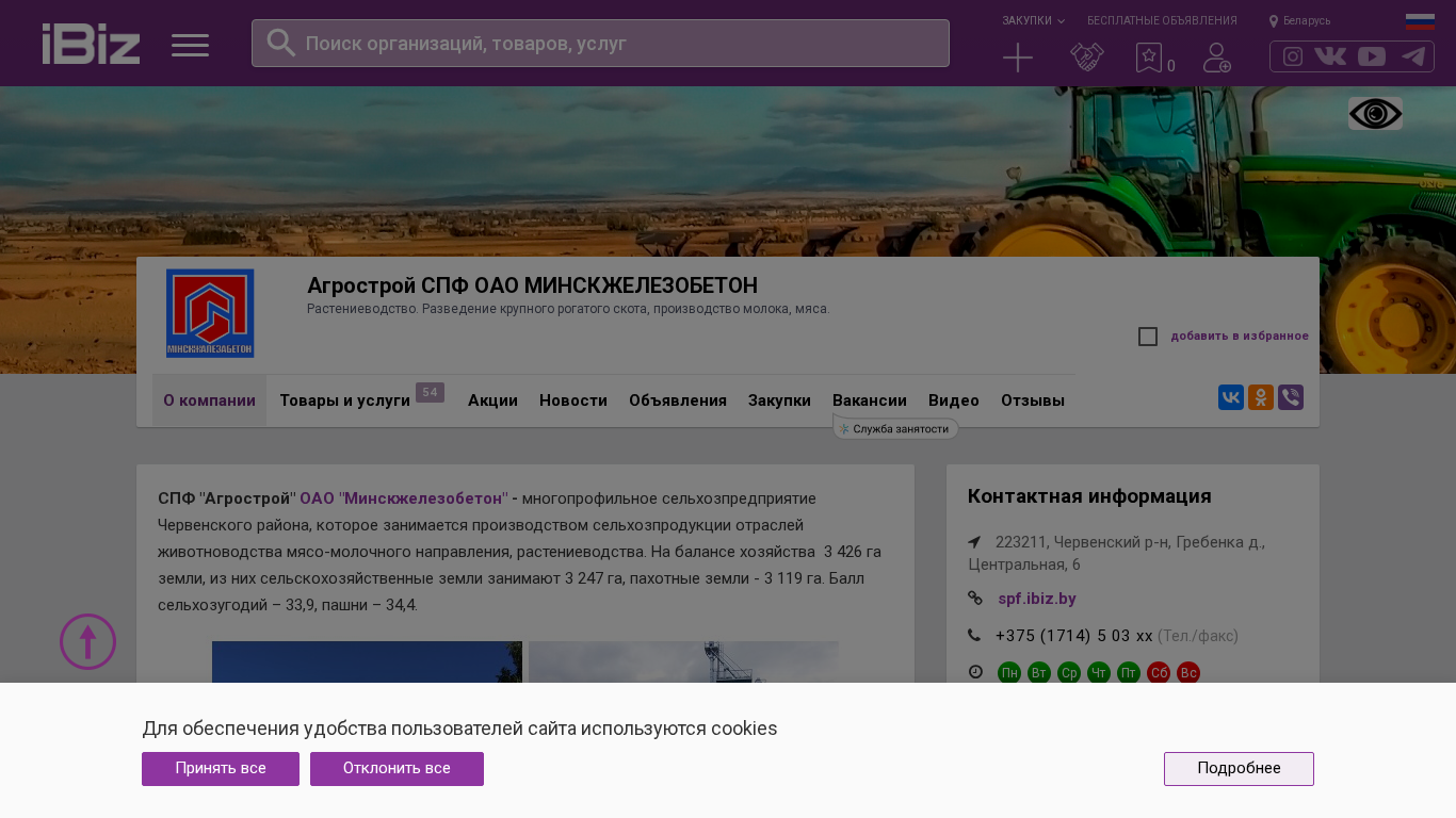 | AI-анализ | The website is a farming enterprise named "Агрострой СПФ ОАО МИНСКЖЕЛЕЗОБЕТОН," located in Belarus, Chervensky district, at the address Гребенка д., Центральная, 6. The business specializes in agriculture, focusing on livestock farming of over 2,200 heads, including 600 cows, and crop production of potatoes, grains, vegetables, and rapeseed. The landholding covers approximately 3,426 hectares, with 3,247 hectares dedicated to agricultural use, including 3,119 hectares for arable land. The farm features a wheat ball of 33.9 and a pasture ball of 34.4. Their product range includes potatoes, cereals, vegetables |
