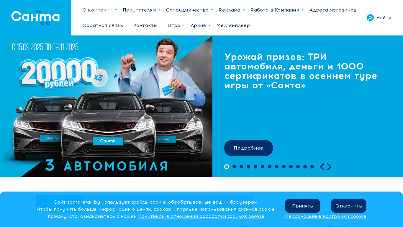 | SEO-описание | Добро пожаловать на официальный сайт сети магазинов и супермаркетов Санта по всей Беларуси! |