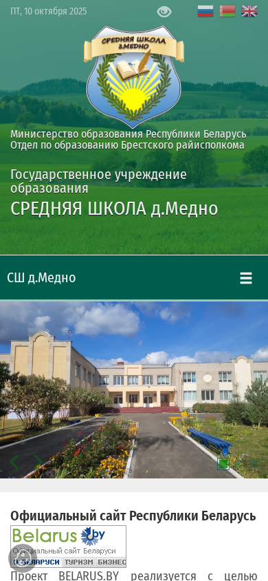 | AI-анализ | The web project "SREDNYA SHKOLA д.Медно" (Middle School in d.Medno) is a public education institution website created by the Ministry of Education of the Republic of Belarus and the Brest regional executive committee. The site provides information on the school's location, schedule, contacts, and administrative procedures. It also includes sections on the school's history, leadership, and extracurricular activities. The site is divided into several main topics, including the school's timetable, contacts, educational policies, and various announcements. Visitors can find information on the school's academic programs, student services, and community engagement opportunities. The site also includes a section for parents, with information on school fees and educational materials. The site is available in Russian and English, and Belarusian, and is accessible through a search engine or by entering the domain name med |