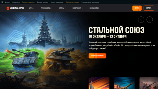 | AI-анализ | The portal 'Mir Tankov' - official website of the free online game about Tanks. Menu: Mir Tankov (Lesta.ru) Game Download game News Latest changes Rankings Tankology Promo codes Newcomer's guide Gameplay Game economy Safety Achievements Play by the rules Clans Ukreprayon Global map Ranking of clans Clan portal My clan Join a clan Alley of Fame eSports Daily tournaments Portal of eSports Guide to participation Community Find players Forum Media Portal of Volunteers Wiki-encyclopedia Login Play Register Logout or create an account My gaming profiles: Login Create account arrow up Games More about games: Mir Tankov Links Site of the game Forum Support Center Clans Mir Tankov Command team action game. Over 600 military technology models from the Second World War. A massive multiplayer online game ( |