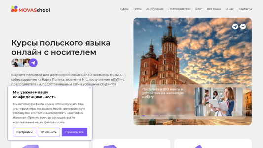 | AI-анализ | The website is an online language school offering Polish language courses from A1 to C1 level, with certificates issued. The description mentions online classes in mini-groups, a variety of programs and levels, individual lessons, intensive and express courses, and a conversation club. Prices are stated to be low. The website uses cookies for improving user experience, displaying personalized ads or content, and analyzing traffic. The user is informed about the use of cookies and has the option to accept, reject or modify cookie settings. The cookies used include those for essential website functions, YouTube video preferences, and last search result entry on YouTube. The domain is movaschool.pl. |