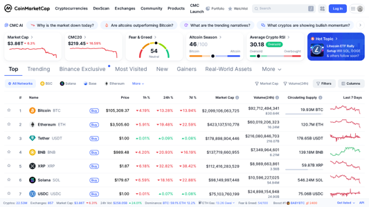 | AI-анализ | The portal provides real-time information on cryptocurrency prices, charts, and market capitalizations, with free access to current and historical data for Bitcoin and thousands of altcoins. Users can explore various categories, rankings, and indexes, including market overview, historical snapshots, token unlocks, yield, real-world assets, leaderboards, trending, and upcoming coins. The site offers tools such as Fear and Greed Index, Altcoin Season Index, Bitcoin Dominance, Crypto ETFs, Market Cycle Indicators, and Relative Strength Index (RSI), among others. Additionally, users can access community feeds, topics, news, and educational resources. The market capitalization is $3.86T, with a 6.3% increase in the last 24 hours, and the Fear & Greed Index is neutral at 54. |