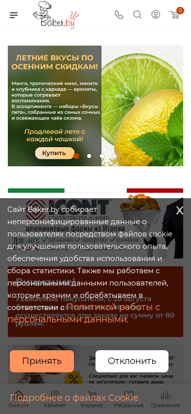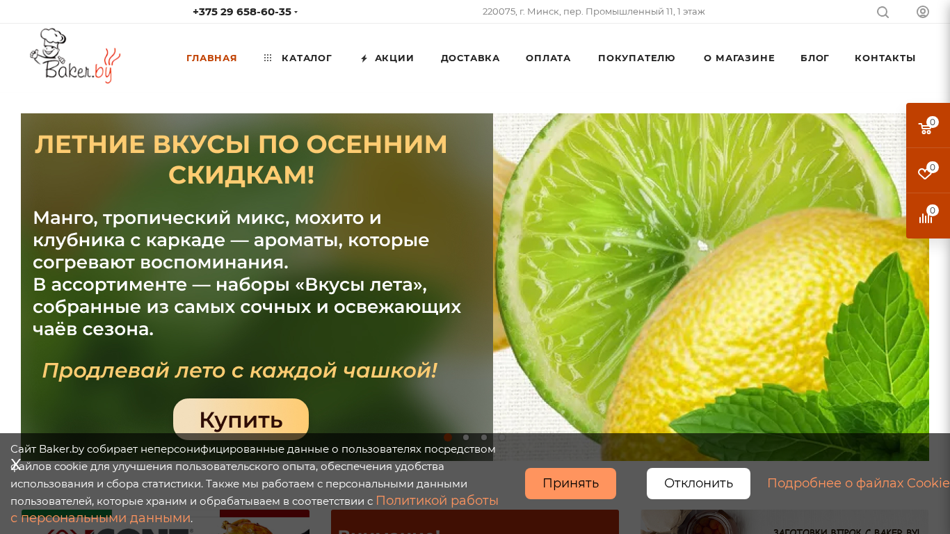 | SEO-описание | Интернет-магазин кондитерских ингредиентов, упаковки и приспособлений для выпечки Baker.by в Минске. Доставка по Беларуси, России и СНГ. Все для кондитеров, пекарей и кулинаров по оптимальным ценам |