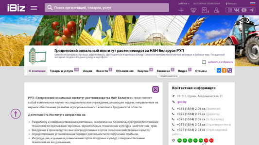 | Название / Заголовок | Гродненский зональный институт растениеводства НАН Беларуси РУП - Семенной материал зерновых, зернобобовых, крестоцветных и крупяных культур. Семенной материал многолетних злаковых и бобовых трав. Посадочный материал плодово-ягодных культур и картофеля. 231513, Щучин, , Академическая, 21 |