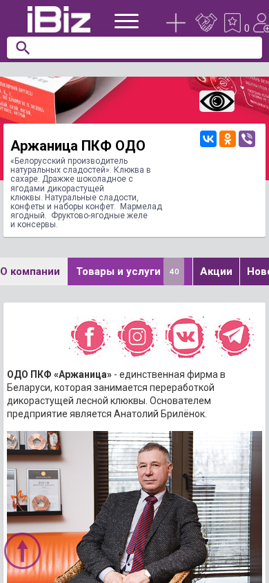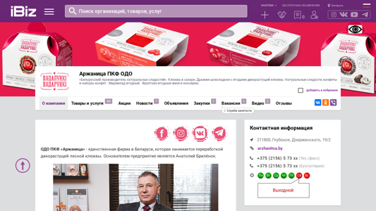 | AI-анализ | This website is for Arzhanitsa PKF ODO, a Belarusian producer of natural sweets. The products include cloves in sugar, chocolate-covered cloves with wild berries, natural sweets, candies and candy sets, fruit-berry jams, and fruit-berry jellies and canned fruits. The website provides a map for directions, contact phone numbers, and the address of Arzhanitsa PKF ODO. 211800, Gubkovo, Minsk region, Dzerzhinskogo, 19/2. The company specializes in the processing of wild forest cloves and was founded by Anatoly Bryleyn in 1996. The first product released was the popular branded item "Клюква в сахарной пудре" (cloves in sugar powder). The product |