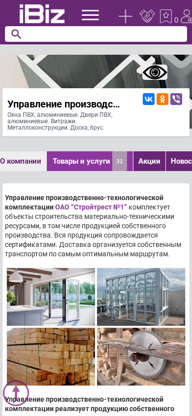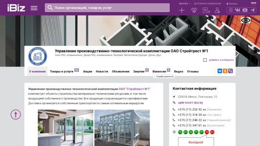 | Название / Заголовок | Управление производственно-технологической комплектации ОАО Стройтрест №1 - Окна ПВХ, алюминиевые. Двери ПВХ, алюминиевые. Витражи. Металлоконструкции. Доска, брус.. 220034, Минск, , Платонова, 15 |