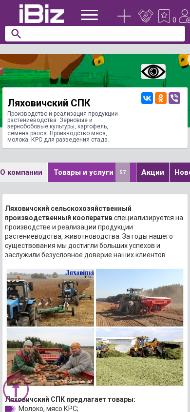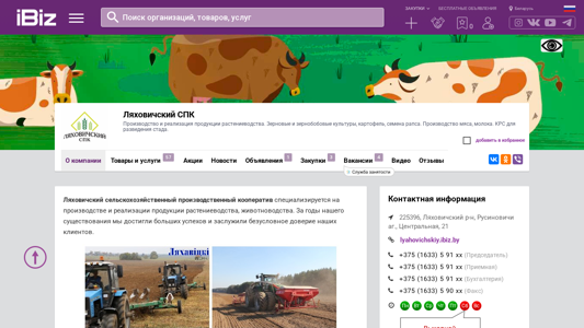 | Название / Заголовок | Ляховичский СПК - Производство и реализация продукции растениеводства. Зерновые и зернобобовые культуры, картофель, семена рапса. Производство мяса, молока. КРС для разведения стада.. 225396, , Русиновичи аг., Центральная, 21 |