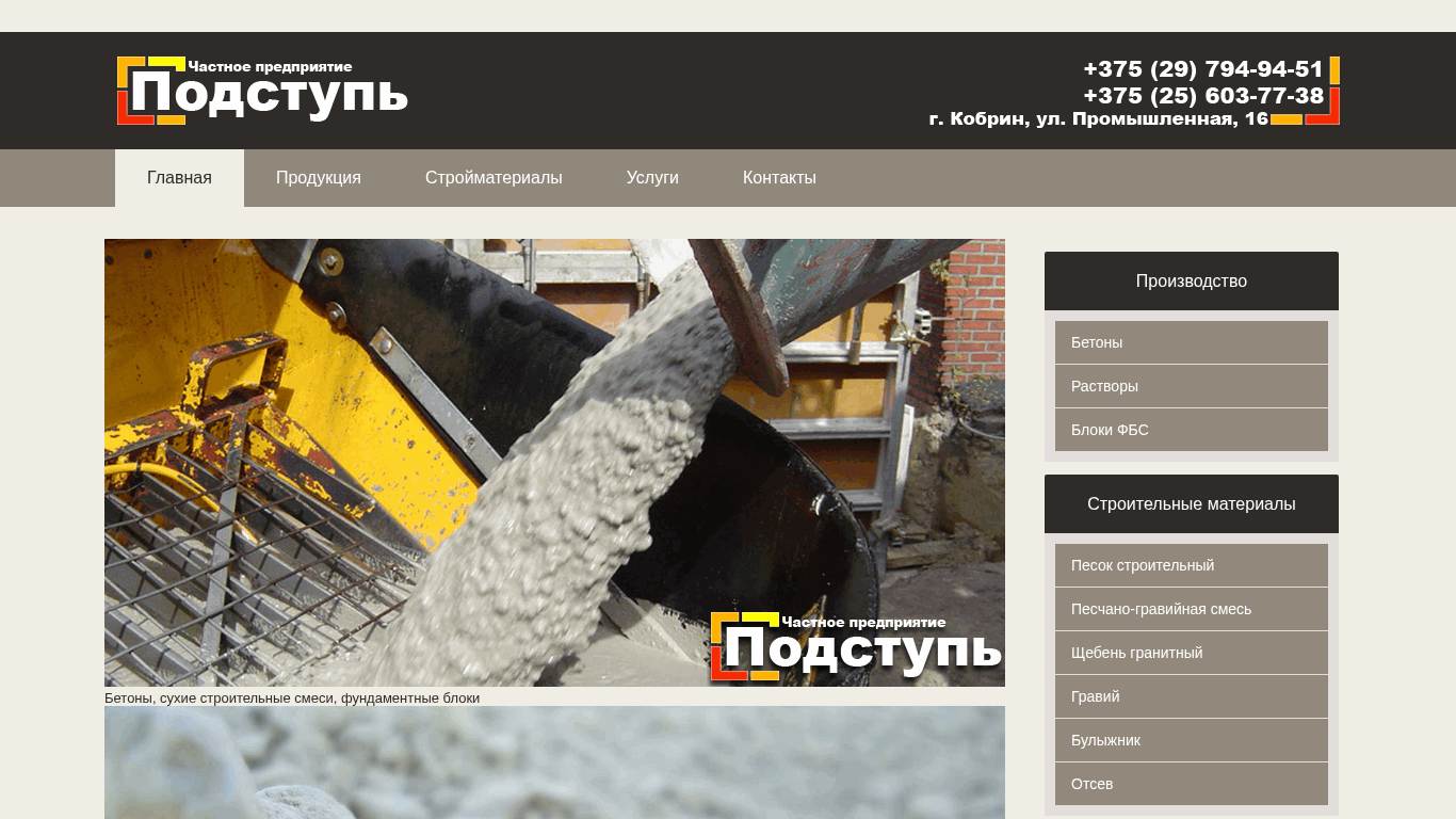 | Название / Заголовок | Частное предприятие "Подступь" | Бетон в Кобрине | Изделия из бетона в Кобрине |
