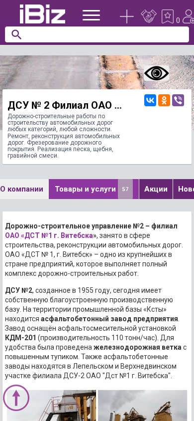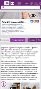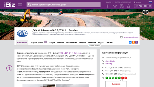 | AI-анализ | The web project "DSU № 2 Filial OAO DST № 1 g. Vitsebsk" is a construction company specializing in building and repairing roads of all categories and complexities. Services include road construction, repair, and reconstruction, as well as asphalt milling and the sale of sand, gravel, and gravel mixtures. The company is located in the Stryi industrial area in Polotsk, Belarus. They operate one of the largest asphalt plants in the country with a production capacity of 110 tons per hour. The plant is equipped with a KDM-201 asphalt mixing plant and has a railway connection for easy transportation. The company also has asphalt plants in the Lepeльsk and Verhnyadzvinski districts of the Polotsk region. DSU № 2 offers a full range of road construction |
