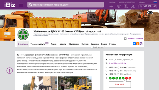 | Название / Заголовок | Жабинковское ДРСУ №103 Филиал КУП Брестоблдорстрой - Строительство, реконструкция, ремонт обслуживание автомобильных дорог. Продажа, доставка песчано-гравийной смеси, песка природного. Аренда дорожно-строительной техники. . 225101, Жабинка, , Пушкина, 10 |