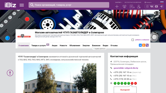 | AI-анализ | The web project "Gazavtolider-Soligorsk" is a retailer and wholesaler of automotive parts in Soligorsk, Belarus. The company specializes in selling parts for GAZ, Vaz, Uaz, Paz, Maz, Mtz, and Zil vehicles, as well as for foreign brands and agricultural machinery. Gazavtolider-Soligorsk is an official dealer of the OAO Gaz factory. The product range includes original and non-original spare parts (of proven quality), automotive chemicals, auto cosmetics, lubricants, batteries for cars, trucks, diesel engines, motorcycles, and charging devices; tires, wheels, and wheel rims; tool sets, and accessories for vehicles. The company has branches in Copyle, Slutsk, and a partner service station "Linea kachestva". Payments can |