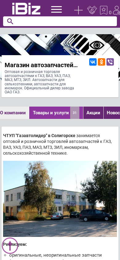| Название / Заголовок | Магазин автозапчастей ЧТУП ГАЗАВТОЛИДЕР в Солигорске - Оптовая и розничная торговля автозапчастями к ГАЗ, ВАЗ, УАЗ, ПАЗ, МАЗ, МТЗ, ЗИЛ. Автозапчасти для сельхозтехники, автозапчасти для иномарок. Официальный дилер завода ОАО ГАЗ. . 223710, Солигорск, , Любанское шоссе, Промышленная площадка |