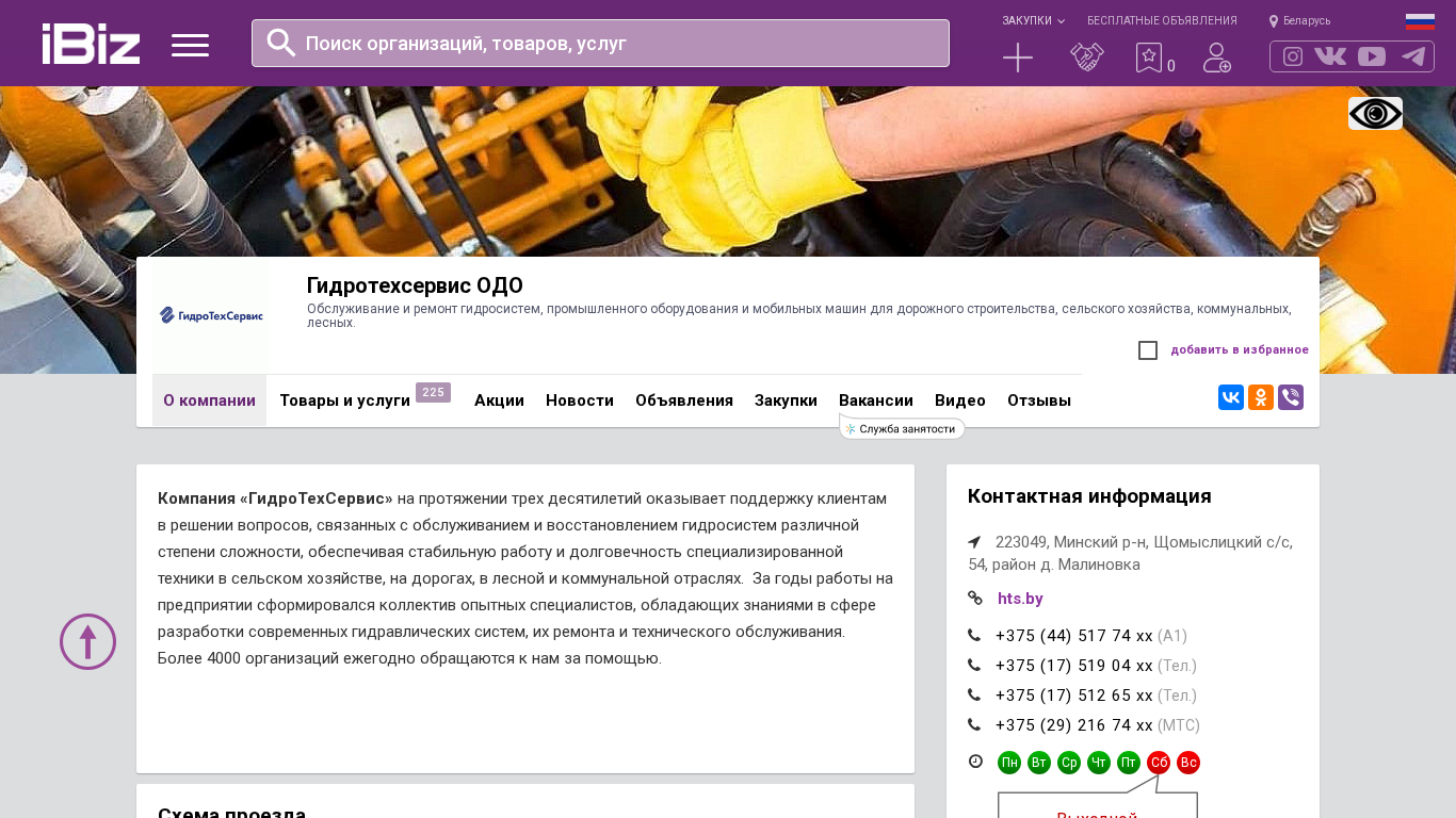 | AI-анализ | The website is for the Belarusian company "Гидротехсервис ОДО" that offers servicing and repair of hydrosystems, industrial equipment, and mobile machines for road construction, agriculture, communal, and forestry use. The company's location is in the village of Malinovka, in the Schomylitskiy rural council, Minsk region, with the postal code 223049. The website provides a map for navigation, contact phone numbers, and the address of the company. Keywords related to the company's offerings include hydraulic cylinders, pumps, buying, MTS, cylinders, Amkodor, repair, hydraulic distributors, hydraulic systems, hydraulics, filters, hydromotors, hydraulic systems, lifting, G |