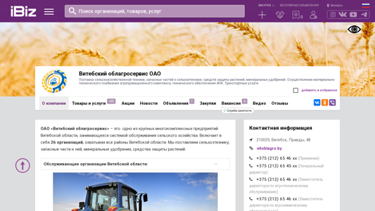 | AI-анализ | The web project "Vitoblagro.ibiz.by" is a Belarusian agricultural service provider based in Vitsebsk, offering sales of agricultural machinery, spare parts for agricultural equipment, pesticides, and fertilizers. They also provide material and technical support for the agroindustrial complex and technical services. Additionally, they offer transport services. The company's address is at Правды, 48 in Vitsebsk, with contact information and a map available on the site. The organization includes 26 subsidiaries serving all districts in Vitsebsk region. Keywords: agricultural machinery, spare parts, pesticides, fertilizers, material and technical support, technical services, transport services, Vitsebsk, Belarus. |