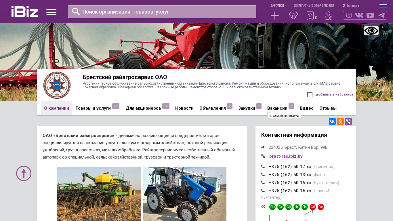 | AI-анализ | The portal Brestsky rayagroservis OAO offers agricultural technical services to organizations in the Brest region. It provides repair and maintenance services for machinery and equipment used in agriculture. Maz service is available. The portal also offers turning, milling, and welding services, as well as tractor repair for MTZ and agricultural machinery. The contact details, address, and map of the company, Brestsky rayagroservis OAO, are also available on the website. The company specializes in the sale of upland crops, fertilizers, and transportation, as well as metalworking. It has a large fleet of specialized, agricultural, freight, and tractor vehicles. The main activities of OAO Brestsky rayagroservis include the repair and maintenance of general and specialized machinery, technical service and repair of automobiles, and the sale of crops, fertilizers, |