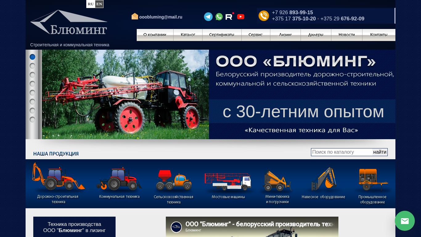 | SEO-описание | Общество с ограниченно ответственностью «Блюминг» основанное в 1995 является белорусским производителем и поставщиком дорожно-строительной, коммунальной и сельскохозяйственной техники. |